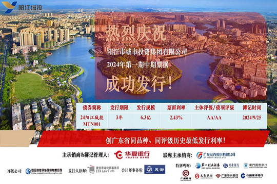 2024年9月26日,市城投集團(tuán)在中國(guó)銀行間交易商協(xié)會(huì)成功發(fā)行“陽(yáng)江市城市投資集團(tuán)有限公司2024年第一期中期票據(jù)”。本期債券發(fā)行規(guī)模為6.3億元,期限為3年,票面利率2.43%,全場(chǎng)倍數(shù)超過(guò)2.52倍。本期債券創(chuàng)下了廣東省同...