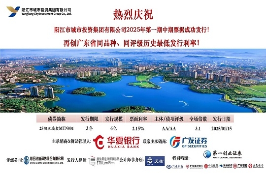 2025年1月15日,市城投集團(tuán)在中國(guó)銀行間交易商協(xié)會(huì)成功發(fā)行“陽(yáng)江市城市投資集團(tuán)有限公司2025年第一期中期票據(jù)”。本期債券發(fā)行規(guī)模為6億元,期限為3年,票面利率2.15%,全場(chǎng)倍數(shù)超過(guò)3.1倍,合計(jì)申購(gòu)機(jī)構(gòu)數(shù)23家。本期債...